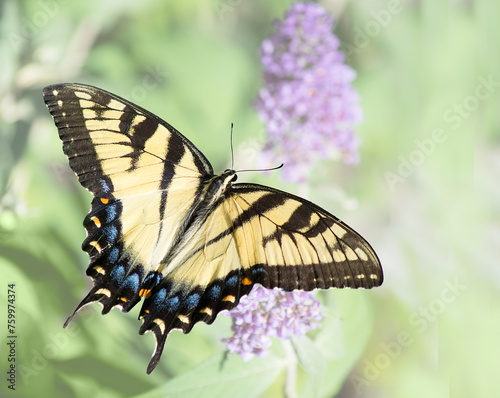 © KQ Ferris, Fototapeta premium Dorsal view of a y ellow Swallowtail butterfly with purple butterfly bush and pale green background