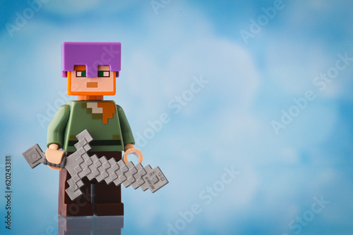 Fototapeta premium Dortmund - Deutschland 4. Juli 2023 Lego Minifigure Minecraft Alex mit Helm und Schwert