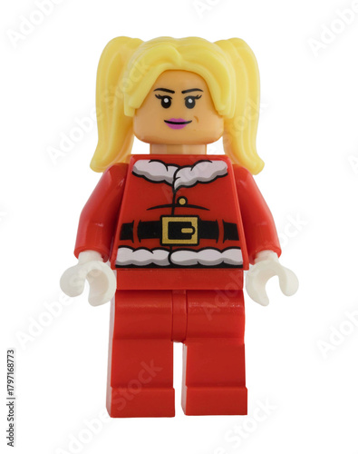 Naklejka premium Dortmund - Deutschland 13. November 2025 - Lego Figur blonde Frau im Nikolaus Kostüm - Studio Aufnahme