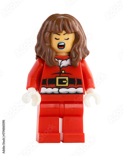 Naklejka premium Dortmund - Deutschland 13. November 2025 - Lego Figur Frau im Weihnachtsmann Kostüm - Studio Aufnahme