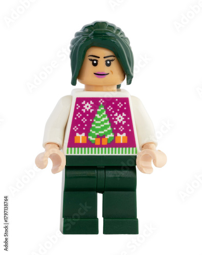 Naklejka premium Dortmund - Deutschland 13. November 2025 - Lego Figur Frau mit Tannebaum Pullover- Studio Aufnahme