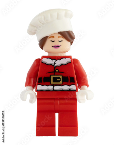 Naklejka premium Dortmund - Deutschland 13. November 2025 - Lego Figur glückliche Bäckerin im Nikolaus Kostüm - Studio Aufnahme