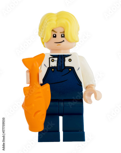 Obraz premium Dortmund - Deutschland 4. November 2025 - Lego Figur Sanji mit Fisch blickt böse der Serie One Piece - Studio Aufnahme
