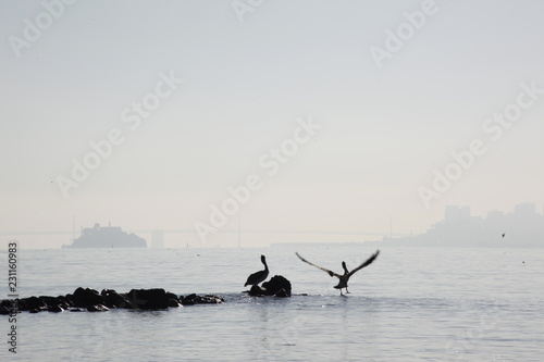 © marian, Fototapeta premium dos pelícanos a contraluz, uno de ellos con alas extendidas, al fondo la silueta de san francisco y la isla de alcatraz
