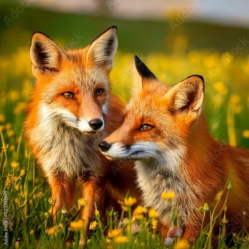 © Asynjur, Obraz premium Dos zorros juntos en un campo de flores