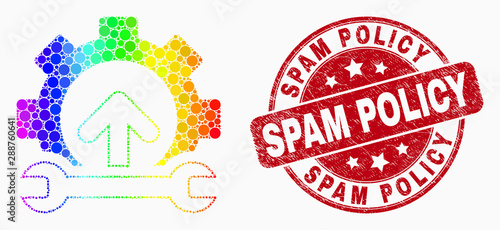 Obraz premium Dot spectral gear integration arrow mosaic pictogram and Spam Policy seal stamp. Red vector round distress seal stamp with Spam Policy text. Vector combination in flat style.