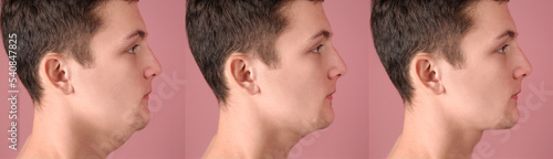 Obraz premium Double chin problem. Collage with photos of man before and after plastic surgery procedure on pink background, banner design
