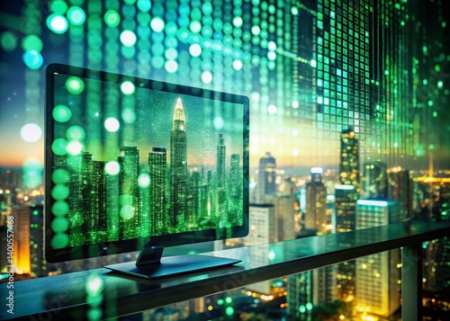 © prapatsorn, Naklejka premium Double Exposure: Coding Abstract, Green Code Lines on Cityscape Background