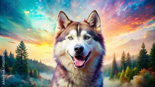 Naklejka premium Double Exposure Husky Dog Smile, Surreal Pet Portrait, Artistic Canine Photography, Dreamy Animal Image