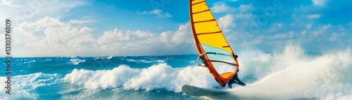 © Design@22, Naklejka premium Double exposure of a windsurfer in motion blended with crashing waves, artistic conceptual shot