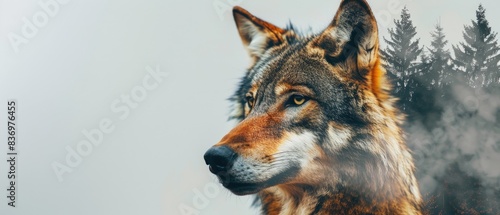 Fototapeta premium Double exposure of a wolf and a dense forest