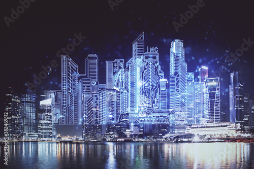 Naklejka premium Double exposure of buildings hologram over cityscape background. Concept of smart city.