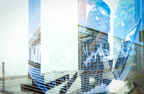 Obraz premium Double exposure of businessman working with new modern computer show social...