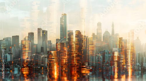 © SU CrossCutting Film, Obraz premium Double exposure of city, graph and rows of coins for finance and banking concept