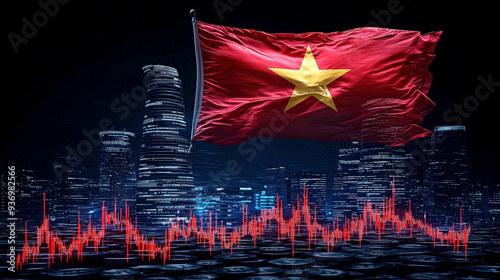 © Jean Isard, Obraz premium Double exposure of coins and Vietnamese flag with skyline