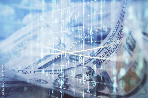 © peshkova, Obraz premium Double exposure of data theme drawing over us dollars bill background. Technology concept.
