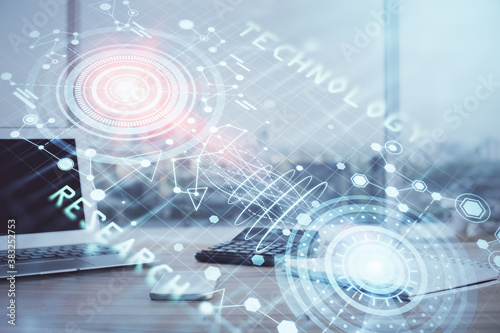 Naklejka premium Double exposure of desktop computer and technology theme hologram. Concept of...