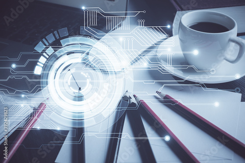 Naklejka premium Double exposure of desktop with computer on background and tech theme...