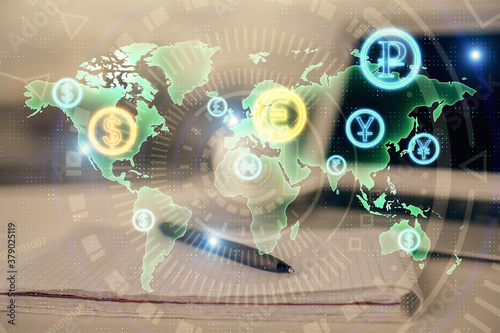 Fototapeta premium Double exposure of financial graph drawings and desk with open notebook background. Concept of forex market