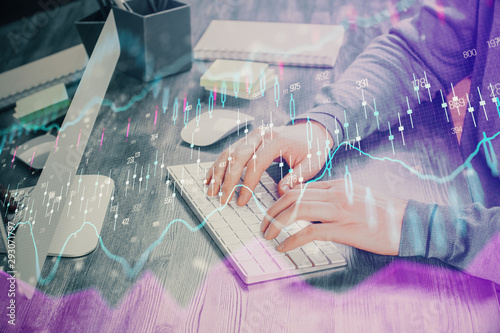 Fototapeta premium Double exposure of financial graph with man works in office on background. Concept of analysis.