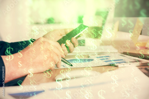 Obraz premium Double exposure of man's hands holding and using a phone and financial graph...