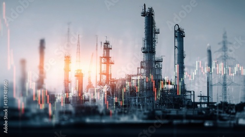 Obraz premium Double Exposure of Oil Refinery Plant with Abstract Data Overlay