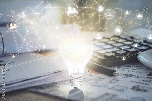© peshkova, Naklejka premium Double exposure of social network theme drawings and desk with open notebook background. Concept of people connection