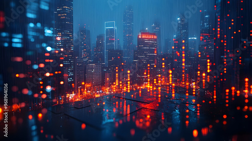 © Natalia, Fototapeta premium Double Exposure of Stock Market Graph and Skyscrapers: Blue-Themed Financial Illustration for Business Concepts