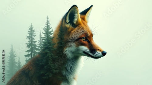 © Giuseppe Cammino, Obraz premium Double exposure portrait of a fox blends with an ancient green forest