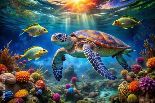 Fototapeta premium Double Exposure: Sea Turtles & Coral Reef, Underwater Ocean Scene