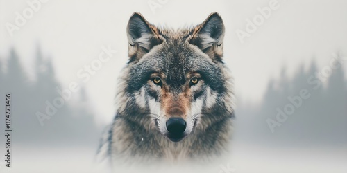 Fototapeta premium Double exposure showcases wolfs intense gaze against white background...