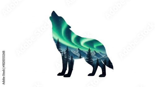 © SmartGunn, Obraz premium Double Exposure Silhouette of Howling Wolf Combined with Aurora Night Forest