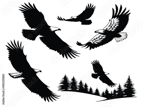 Obraz premium Double exposure-style vector: eagle in flight with a landscape (forest, lake,...