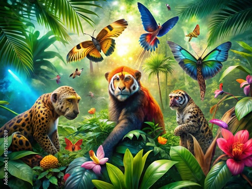© Sirinporn, Fototapeta premium Double Exposure: Tropical Rainforest Animals & Lush Foliage - Stock Photo