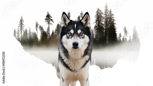 © Roxane Bay, Naklejka premium Double Exposure White Background Husky in front of a forest illustration ~ Created using Generative AI