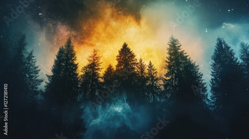 © Ibad, Fototapeta premium Double exposures blending forests with galaxies
