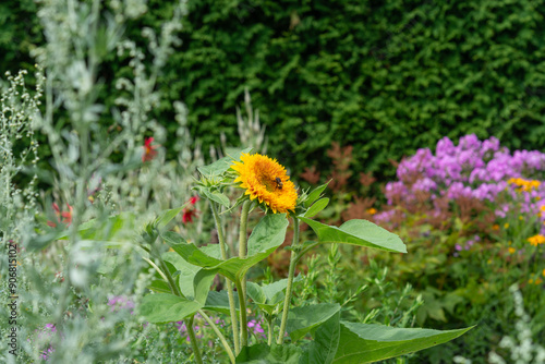© eugen, Obraz premium double-golden orange sunflower with bee in a garden