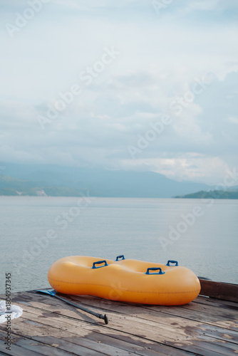 Fototapeta premium double inflatable float on a dock on a beautiful lake surrounded by mountains