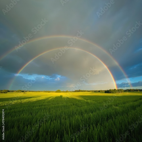 Naklejka premium Double rainbow arches over a green field after rain. Sun shines through clouds on horizon. Nature beauty displays vibrant colors across the sky, marking end of storm.