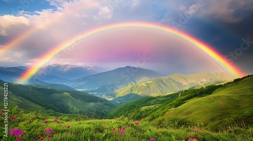 © Tcukimay, Obraz premium Double rainbow arching over lush green mountain valley with wildflowers.