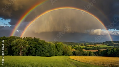 Naklejka premium Double Rainbow Arcing Over Lush Green Fields and Forest