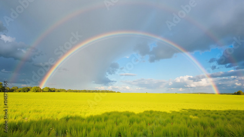 © Olga, Naklejka premium Double rainbow over a green field with blue sky