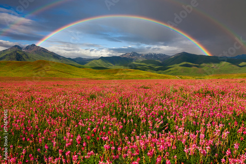 © Anton Petrus, Fototapeta premium Double rainbow over blooming mountain valley