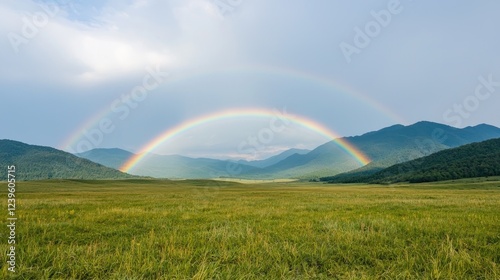 Obraz premium Double rainbow over grassy valley, mountain backdrop, scenic landscape,...