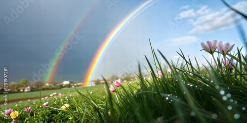 Naklejka premium Double rainbow over green grass field with blooming wildflowers after summer rain