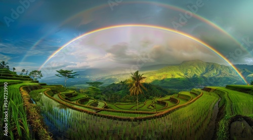 © adri, Obraz premium Double Rainbow Over Lush Green Rice Terraces