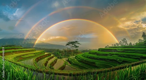 © adri, Obraz premium Double Rainbow Over Lush Rice Terraces