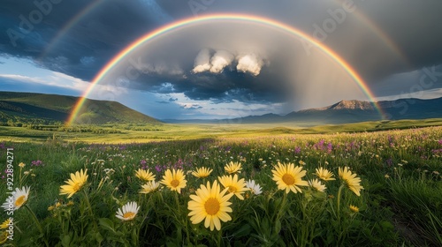 Naklejka premium Double Rainbow Over Wildflowers and Mountains - Breathtaking Landscape Photography.