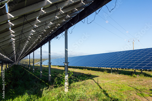 © Ivanb, Fototapeta premium Double solar perspective: Panel details under clear blue sky.