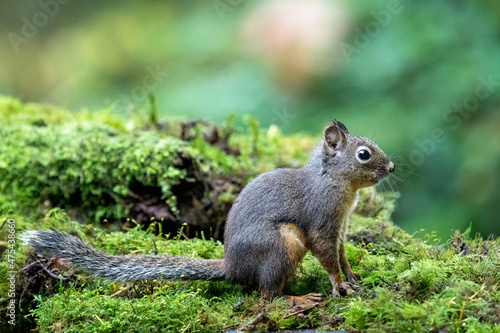 Fototapeta premium Douglas Squirrel sitting on a moss-covered log.